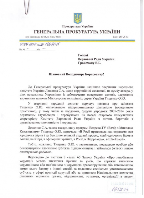 Генпрокурор обратился к спикеру с просьбой "организовать проведение служебного расследования по фактам, изложенным в обращении народного депутата Украины Лещенко С.А., а также Тищенко Е.Ю., которая возможно была учредителем, должностным лицом или бенефициарным владельцем субъекта предпринимательства".