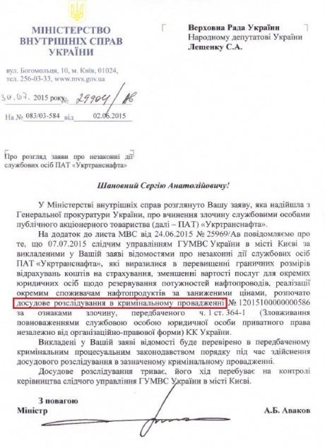 Об этом говорится в ответе МВД на заявление депутата от БПП Сергея Лещенко, который сообщил ведомству о несколько правонарушений со стороны руководства компании.