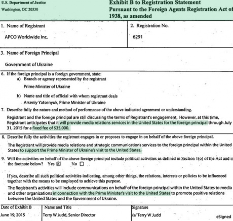 Как свидетельствуют отчеты АРСО в Минюст США, их вашингтонский офис заключил договор на продвижение правительства Украины в июне этого года.