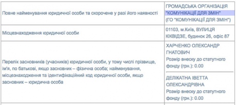 Как пишет депутат, в соответствии с государственным реестром, общественная организация "Коммуникации для изменений" была создана в октябре прошлого года и имеет двух учредителей – Александра Харченко и Иветту Деликатную.