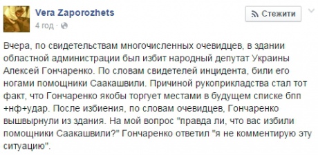 "Вчера, по свидетельствам многочисленных очевидцев, в здании областной администрации был избит народный депутат Украины Алексей Гончаренко. По словам свидетелей инцидента, били его ногами помощники Саакашвили. Причиной рукоприкладства стало то, что Гончаренко якобы торгует местами в будущем списке БПП + НФ + УДАР", - написала Запорожец на своем Facebook.