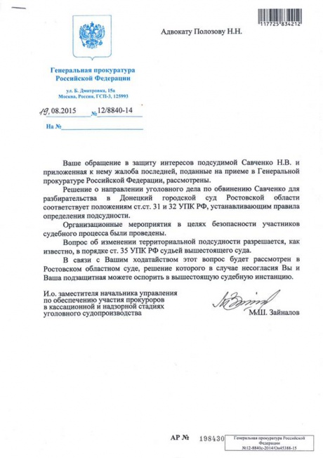 Защита Савченко получила "отписку" из Генпрокуратуры РФ