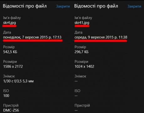 Время публикации файла skr4.jpg более раннее, чем файла skr41.jpg – первый был опубликован 7 сентября, второй – 9 сентября. Кроме того, новый файл не содержит сведений о камере, которой был сделан снимок – это тоже свидетельствует об обработке в фоторедакторе.