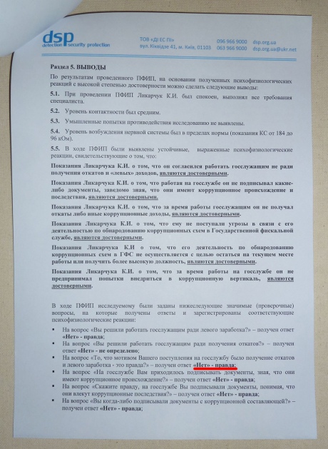 Позже Ликарчук отреагировал на эту информацию, заявив, что сначала на распечатке полиграфа была допущена ошибка, которую потом исправили. Он утверждает, что ответил на вопросы "Нет".