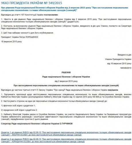 | Указ Порошенко о введении санкций. Скриншот с сайта преидента |