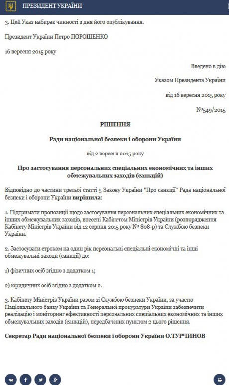 | Указ о введении в силу санкций. Скриншот с сайта СНБО |