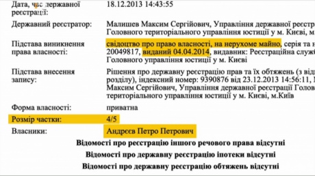 Андреев – бывший руководитель Контрольно-ревизионного управления, которое при Викторе Януковиче переименовали в Государственную финансовую инспекцию. На этой должности он находился с 2010 года, а потерял ее 5 марта 2014-го. Свидетельство о праве собственности на государственное имущество он получил через месяц после отставки.