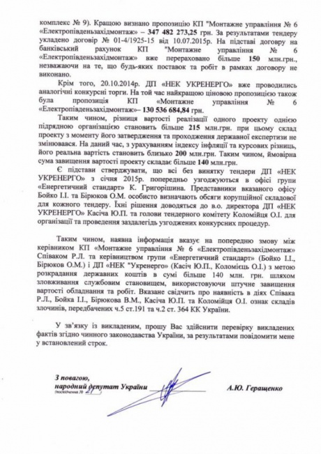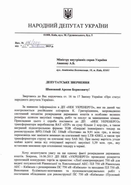 Народный депутат из фракции "Народный фронт" Антон Геращенко просит МВД проверить завышение цен на тендерах "Укрэнерго".