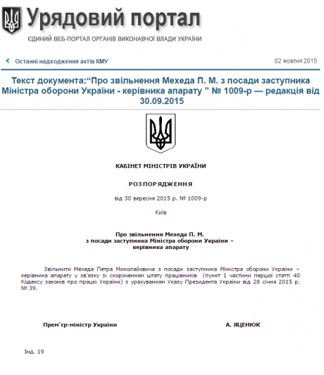 "Освободить Мехеда Петра Николаевича от должности заместителя Министра обороны Украины - руководителя аппарата в связи с сокращением штата работников (пункт 1 части первой статьи 40 Кодекса законов о труде Украины) с учетом Указа Президента Украины от 28 января 2015 № 39", - говорится в документе.
