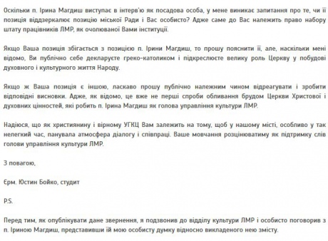 Ранее 7 октября городской глава Львова Андрей Садовой извинился в Facebook за слова Магдиш о роли церкви в жизни львовян, которые она сказала в интервью "Украинской правде. Жизнь".