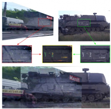 На снимках из России и Украины, геолокацию которых удалось подтвердить Bellingcat, на "Буке 3х2" видны схожие погрузочные маркировки, сохранившиеся элементы номера и белая краска на щитке гусеницы в одних и тех же местах.