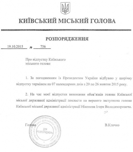 Мэр Киева Виталий Кличко находится в отпуске до 26 октября.