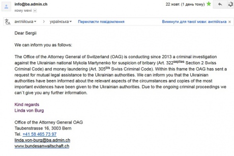 "Офис Генерального прокурора Швейцарии, начиная с 2013 года, проводит уголовное расследование против украинского гражданина Николая Мартыненко по подозрению во "взяточничестве" (статья 322-septies часть 2 Уголовного кодекса Швейцарии) и "отмывании средств" (статья 305-bis Уголовного кодекса Швейцарии)", – сказано в сообщении.