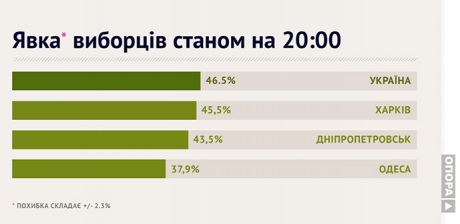 Явка избирателей в городах, где ОПОРА проводит параллельный подсчет голосов: в Одессе проголосовало 37,9% избирателей, в Харькове 45,5% и в Днепропетровске 43,5%
