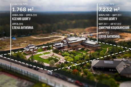 Активисты ФБК обнаружили, что у Шойгу в Барвихе есть два участка площадью 1768 кв. м и 7232 кв. м. Участки оформлены на сестру жены Шойгу Елену Антипину. Она в свою очередь, купила эти два участка (один — в 2010 году, второй — в 2012-м) у дочери министра обороны РФ Ксении Шойгу. В момент купли-продажи участков Ксении Шойгу было 18 лет, и ее доходы не указывались в декларации отца.