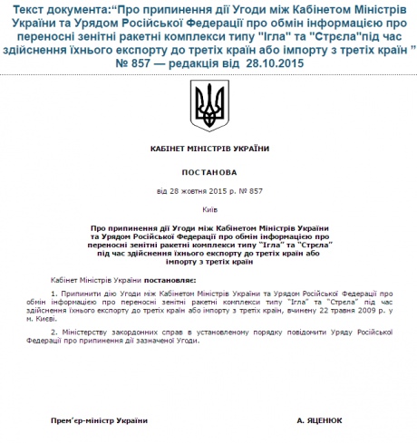"Прекратить действие Соглашения между Кабинетом Министров Украины и Правительством Российской Федерации об обмене информацией о переносных зенитных ракетных комплексах типа "Игла" и "Стрела" при осуществлении их экспорта в третьи страны или импорта из третьих стран, совершенное 22 мая 2009 в г. Киеве", - говорится в документе.