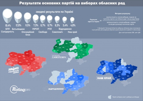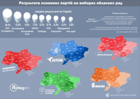 Результат партии по Украине рассчитывался как отношение совокупного числа голосов избирателей, отданных за политическую партию во все областные советы и городской совет Киева к общему количеству голосов избирателей, отданных за местные организации политических партий.