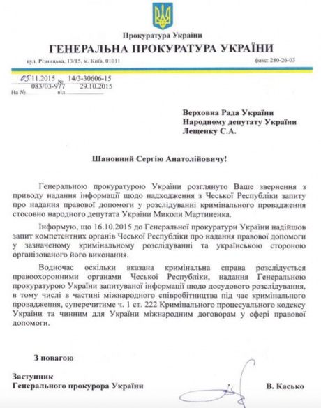 "Информирую, что 16.10.2015 в Генпрокуратуру поступил запрос компетентных органов Чешской республики о предоставлении правовой помощи в указанном уголовном расследовании и украинской стороной организованного его выполнения", - сказано в сообщении.