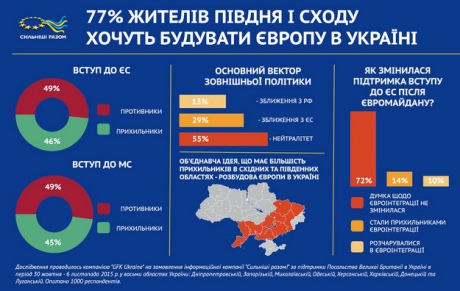 77% опрошенных на востоке и юге Украины граждан поддерживают идею развития Европы в Украине.