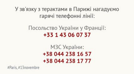 Он напомнил, что посольство Украины во Франции открыло телефон круглосуточной "горячей" линии +33 (0) 143 060 737.