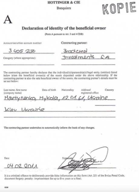 "Совсем печальные новости состоят в том, что швейцарские прокуроры изъяли в женевском банке BNP Paribas и цюрихском Banque Hottinger & Cie так называемую "Форму А", где конечным бенефициаром счетов панамской компании (Bradcrest Investments - УП) указан депутат Николай Мартыненко.