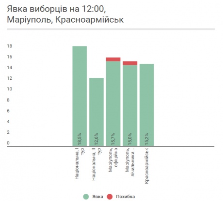 На местных выборах в Мариуполе и и Красноармейске явка избирателей по состоянию на 12:00 составляет 15% и 15,2% соответственно.