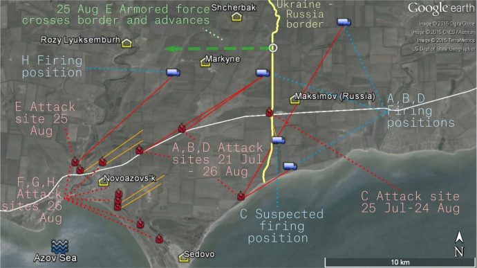 Расследователи также нашли доказательства того, что 25 августа 2014 года вооруженные силы России пересекали границу в районе сел Маркино и Щербак (севернее Новоазовска) и вели огонь по северным и северо-восточным районам Новоазовска (атака E), как об этом сообщали украинские военные и СМИ.