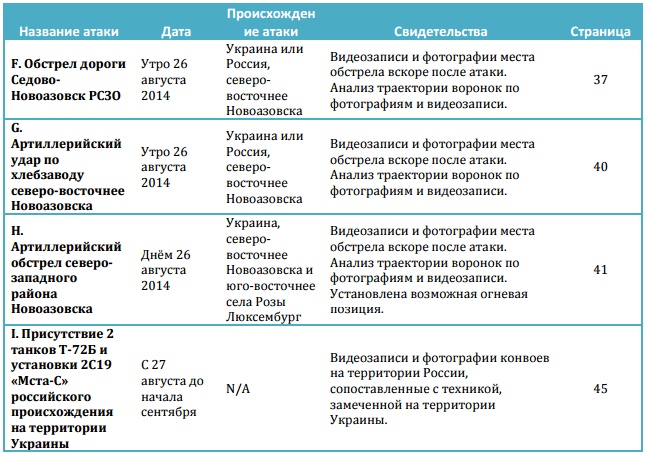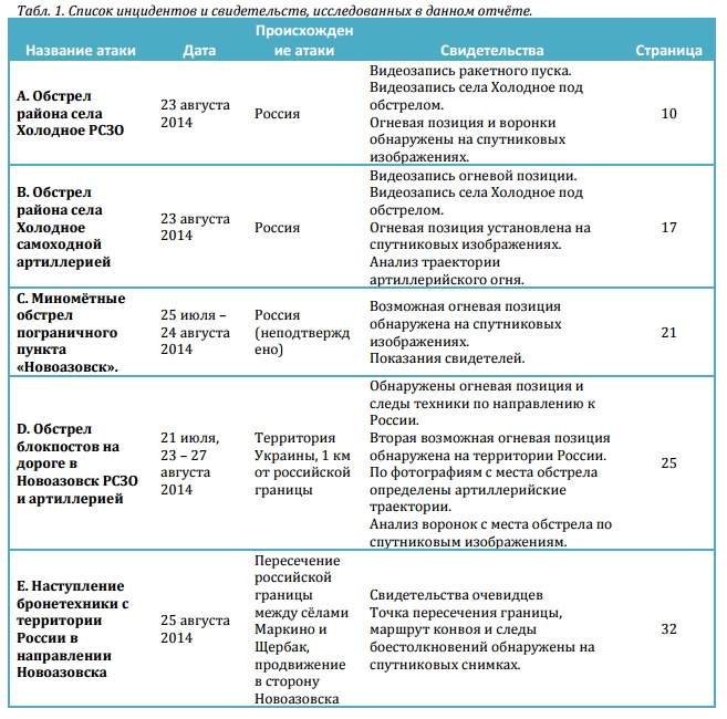 "На основе анализа фото и видео из открытых источников, а также спутниковых снимков района Новоазовска и российско-украинской границы за июль и август 2014 года мы предоставили доказательства нескольких случаев прямого привлечения России к конфликту в этом регионе", - говорится в докладе.