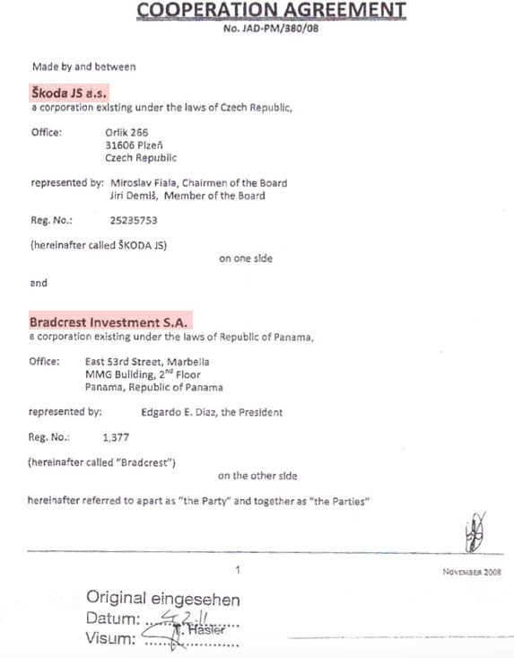 Нардеп также опубликовал сканы основного договора между чешским заводом "Шкода" и панамской компанией Мартыненко Bradcrest, на швейцарские счета которой перечислялась "комиссия" (иными словами – "откат") за поставки оборудования на атомные электростанции Украины.