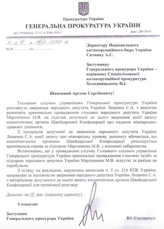 Об этом говорится в письме ГПУ на обращение народного депутата Сергея Лещенко.
