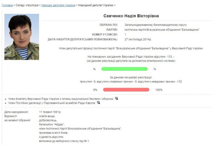 На сайте Рады указано, что Савченко пропустила 133 пленарных заседания и "отсутствовала по неизвестным причинам".