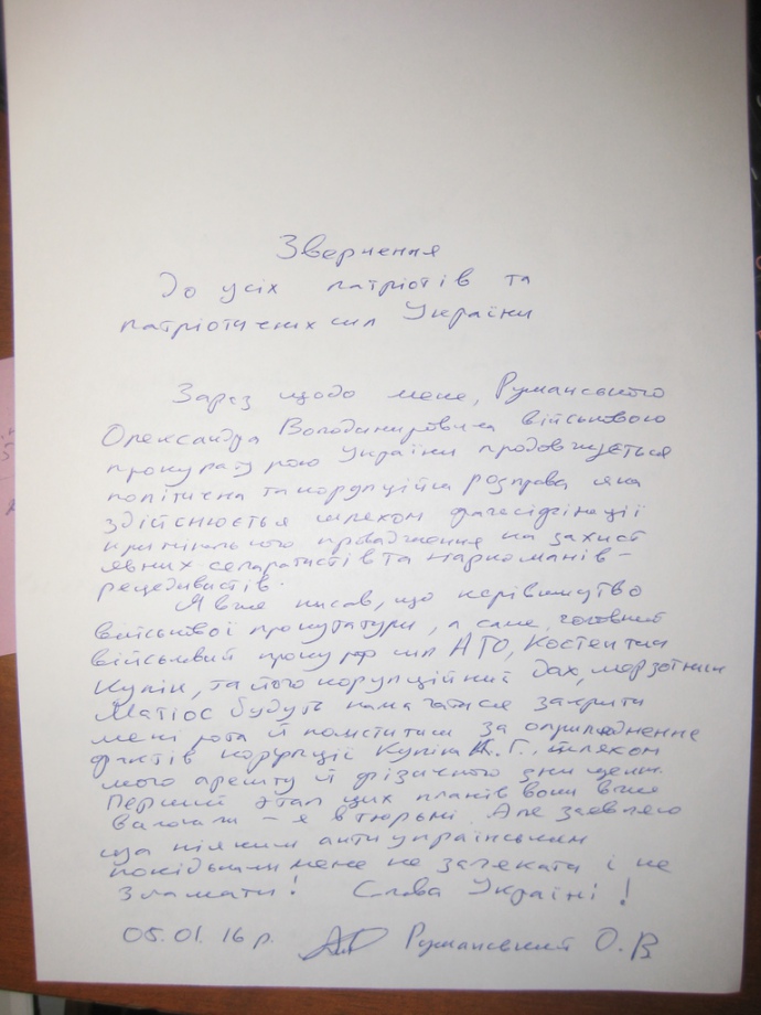 Экс-доброволец Александр Ружанский, который находится под арестом, просит антикоррупционные ведомства вызвать его как свидетеля по делу о коррупции военного прокурора сил АТО Константина Кулика.