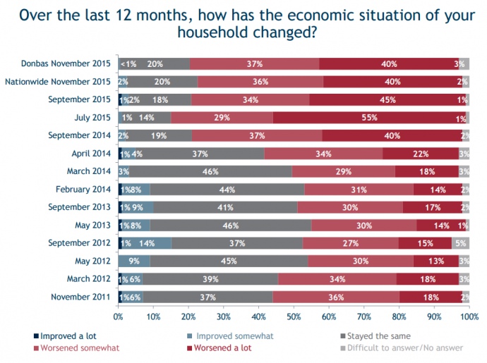 Среди жителей подконтрольного Украине Донбасса ухудшение финансового состояния ощутили 77% (40% – значительное), некоторое улучшение отметили менее 1% опрошенных, значительное улучшение – никто. У 20% опрошенных финансовое состояние не изменилось.
