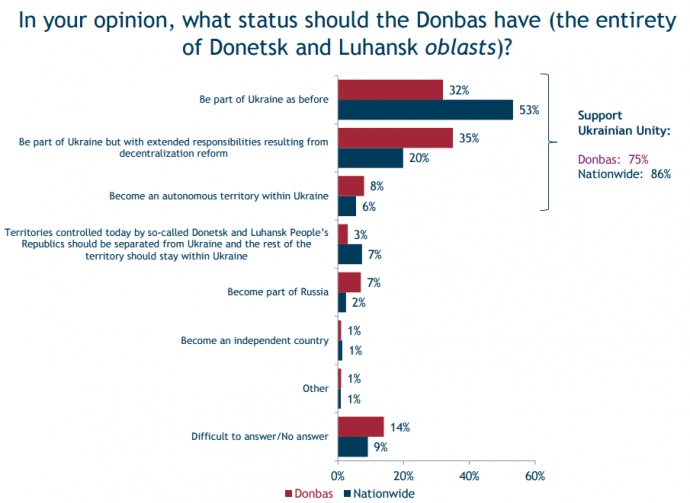 В целом 75% жителей неоккупированной части Донбасса считают, что Донецкая и Луганская области должны в той или иной форме быть частью Украины.
