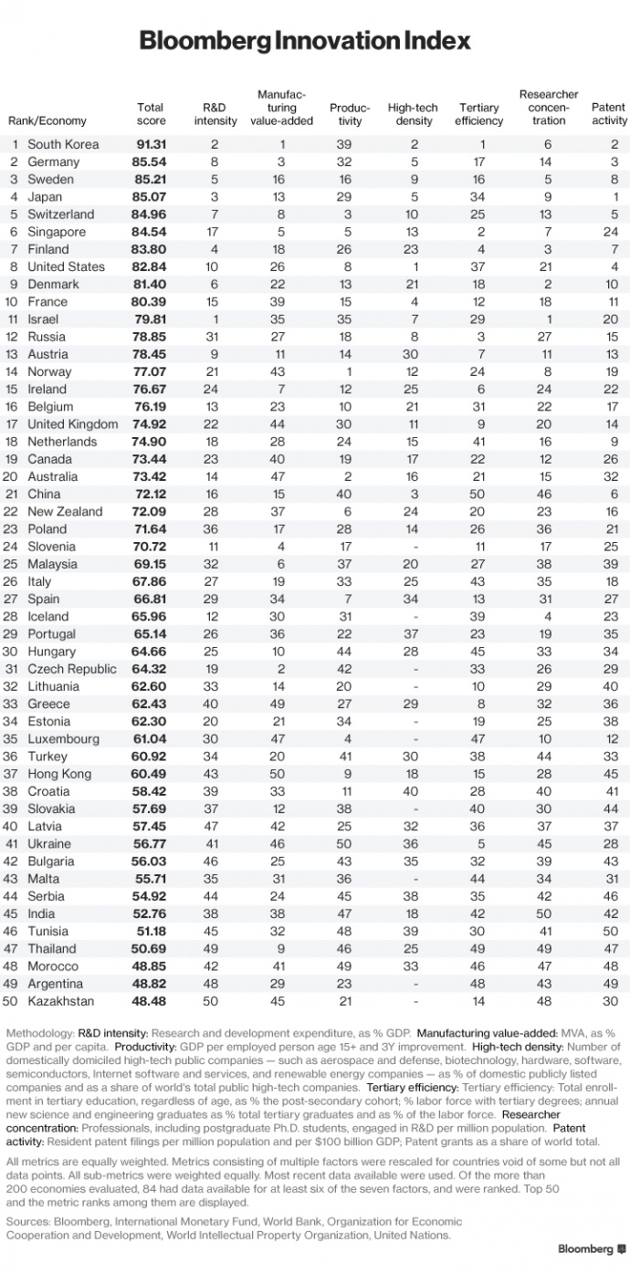 Издание отмечает, что рейтинг формировался с 200 экономик, из которых те, которые не предоставили данные о шести–семи категориях были исключены, что уменьшило список до 84 экономик. Bloomberg обнародовал первые 50 из них.