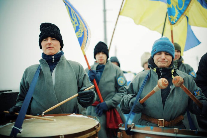 Участники акции пели, били в барабаны, держали в руках буквы, которые составляли слово "Украина".