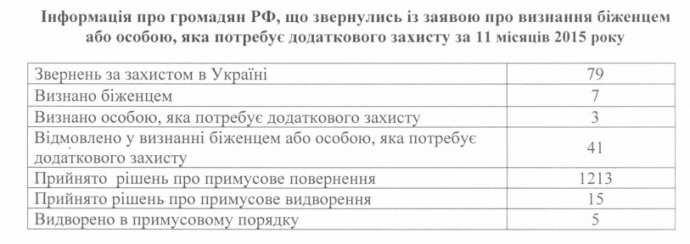 Всего в 2015 году ДМС получила 79 заявлений от граждан РФ о защите в Украине. Статус беженца в Украине получили только 7 из них, еще трое человек признаны нуждающимися в дополнительной защите.