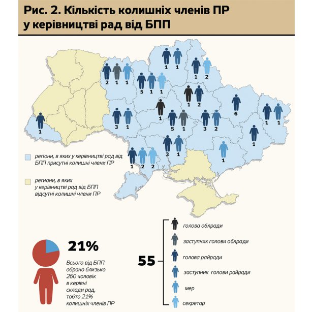 "По состоянию на конец января текущего года в руководство городских, районных и областных советов избраны 260 депутатов от БПП. Из них 55 (21%) – бывшие "регионалы", которые прошли под флагом президентского блока. Это означает, что сегодня каждый пятый местный руководитель от БПП – экс-"регионал", - пишет Бондарь.