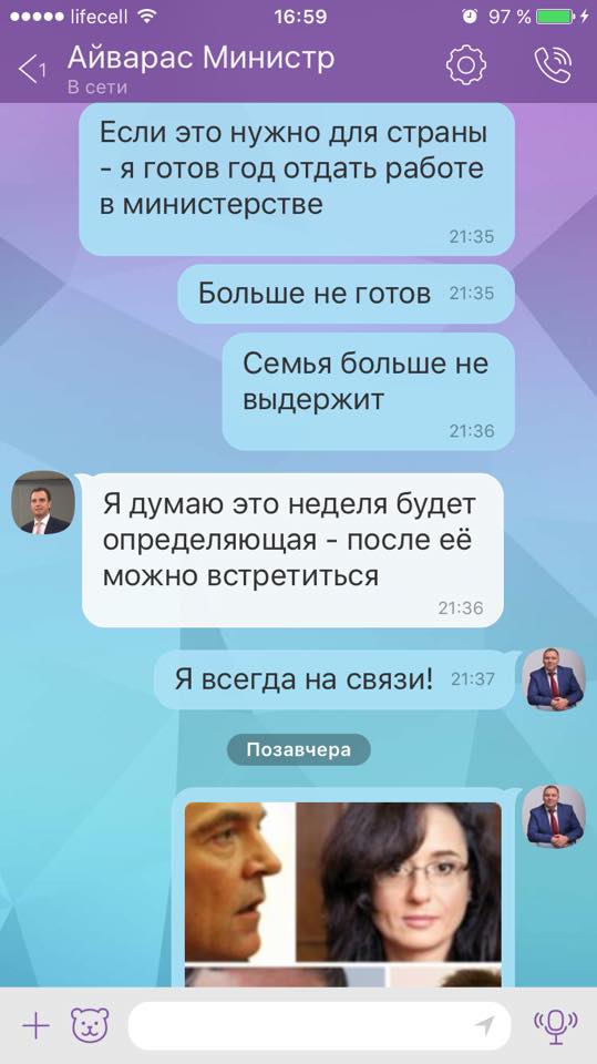 "Опубликованный скрин-шот никоим образом не касается каких-либо назначений. В переписке с Айварасом шла речь исключительно о возможности разделения в будущем имеющейся вакантной должности на две отдельные, которое по моей информации должно было произойти в ближайшее время и всеми было согласовано, поэтому я уверенно сослался на фамилии", - пишет он.