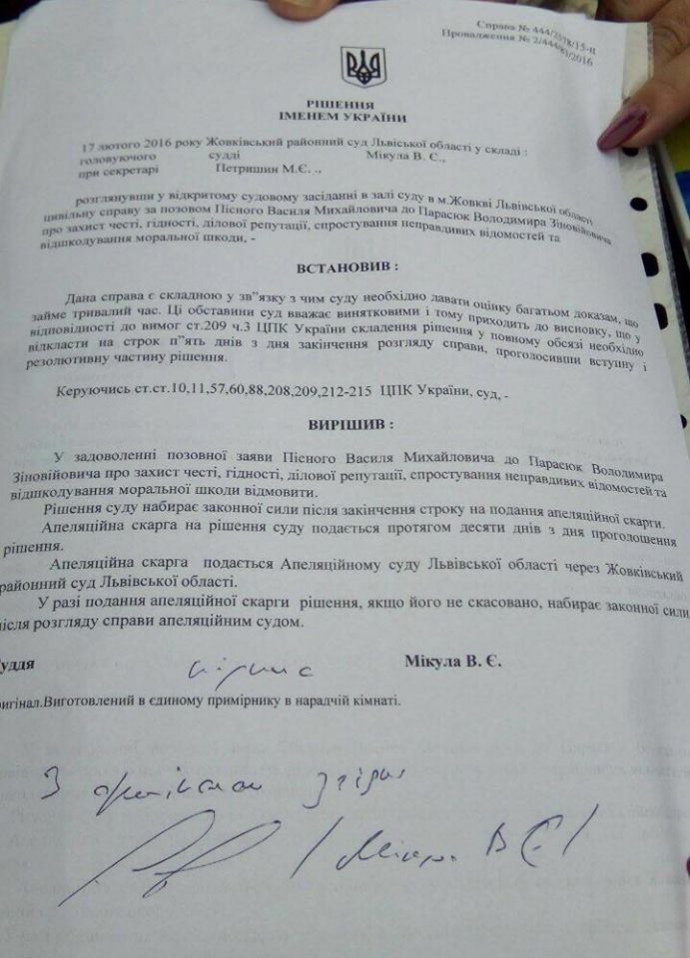 Как известно, Писный подал в суд на Парасюка а статью во львовском издании, где Парасюк назвал его коррупционером.