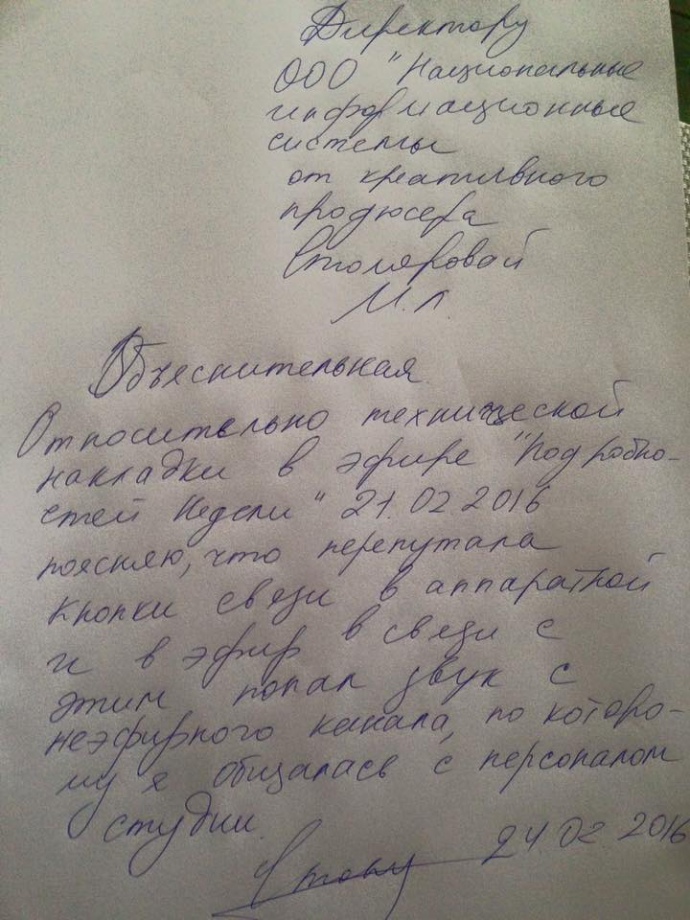Сама продюсер в пояснительной записке утверждает, что ее ругань не касалась включения с Майдана, а направлялась команде в студии.