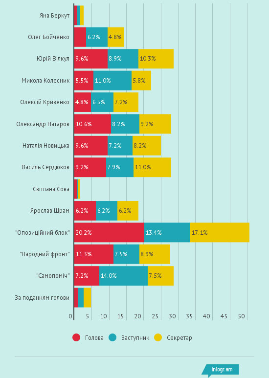 Меньше руководящих должностей - у кандидатов Яны Беркут (самовыдвижение) - 8 (2 голов, 3 заместителя, 3 секретари) и Светланы Совы ( "Сила Людей") - 5 (2 голов, 1 заместитель, 2 секретари).
