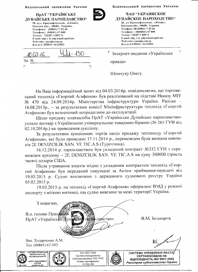 "Украинское Дунайское пароходство" утверждает, что продало теплоход "Георгий Агафонов" турецкой компании 2E DENIZCILIK SAN. VE TIC.A.S., а не монгольской, как об этом сообщалось ранее.