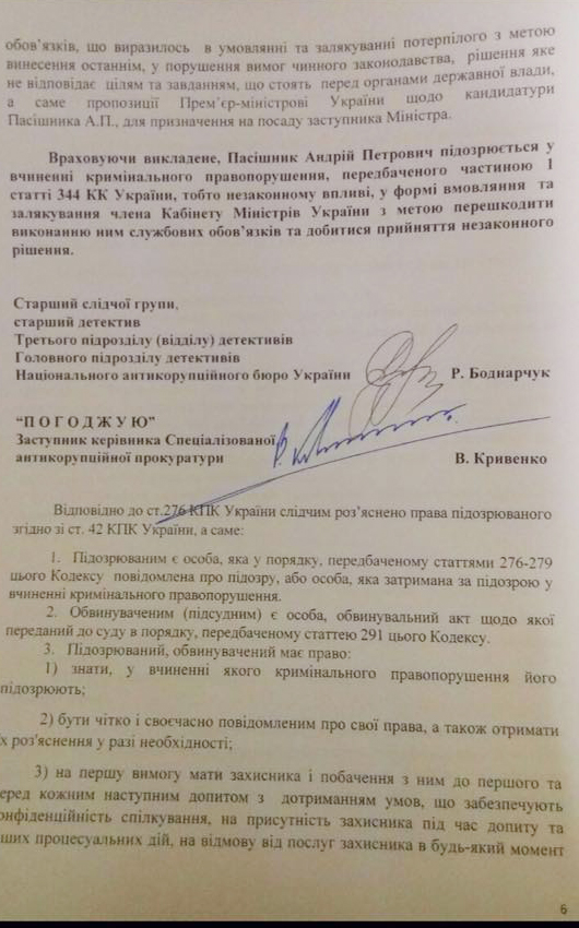 В ходе расследования детективы НАБУ установили факт осуществления 25.01-01.02.2016 незаконного влияния Пасишника на Абромавичуса с целью внесения против воли министра предложения о назначении его на должность заместителя министра.