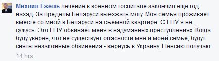 По словам Ежеля, он с семьей находится в Беларуси, живет на съемной квартире, а лечение в военном госпитале закончил еще год назад.