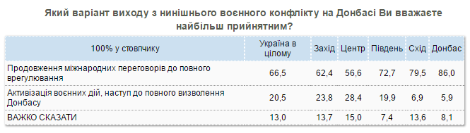 При этом за активизацию военных действий выступают 20,5% опрошенных. Еще 13% не определились со своей позицией.