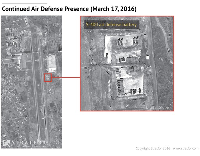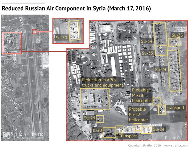 На снимках Stratfor запечатлена авиабаза в Латкаии по состоянию на полдень 17 марта, на тот момент более четверти российской авиагруппы было выведено из Сирии.