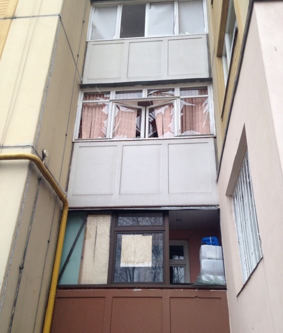 По состоянию на 10:20 утра в дежурную часть Соломенского управления полиции поступило три заявления от жителей дома о повреждении окон в их квартирах.