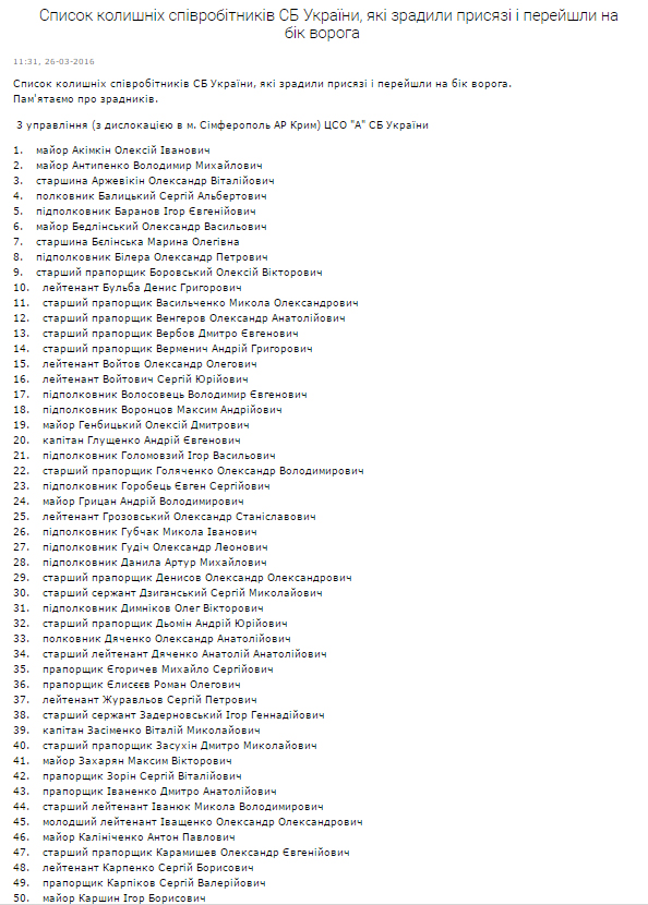 Список из 1391 фамилии размещен 26 марта на сайте СБУ с сообщением "Помним о предателях".