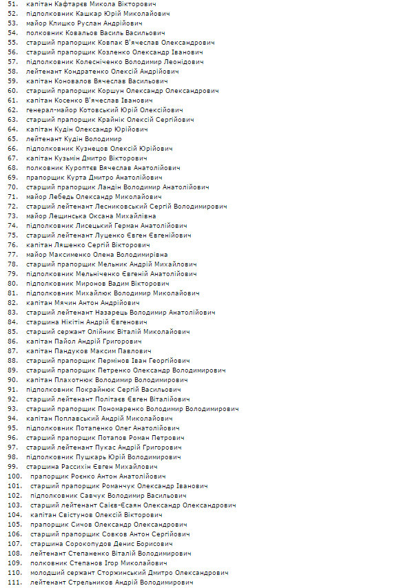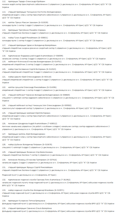 В частности, в список вошли 135 человек из 3-го управления (с дислокацией в г.Симферополь АР Крым) ЦСО "А" СБ Украины, 8 человек из Управления внутренней безопасности СБУ, 817 человек - из ГУ СБУ в АР Крым, 383 - из УСБУ в Севастополе.